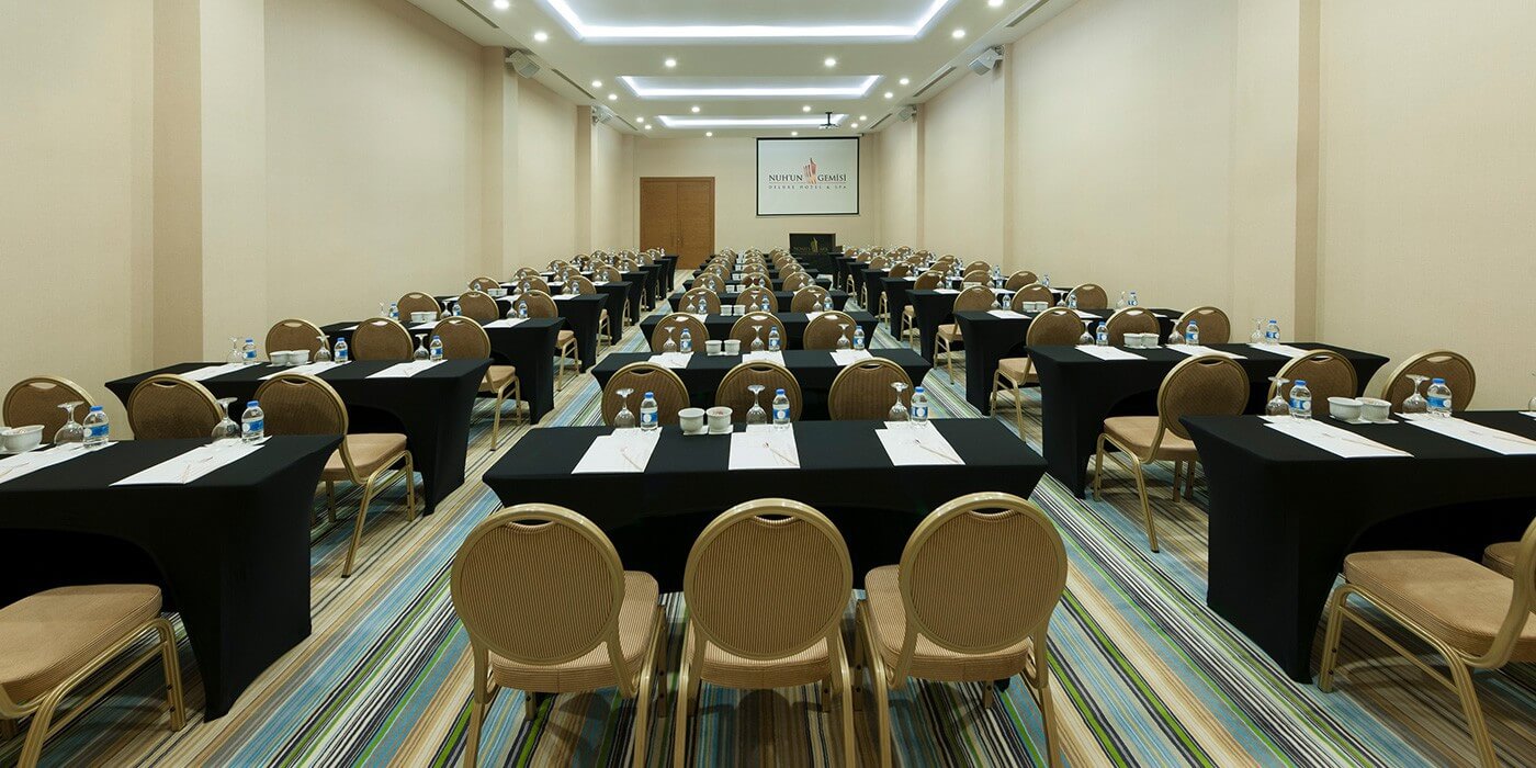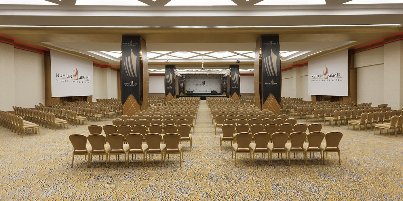 Konforlu, şık ve üstün teknolojiyle donatılmış konferans ve toplantı salonlarıyla iş dünyasının ihtiyaçlarını en iyi şekilde karşılayan Nuh’un Gemisi Deluxe Hotel & Spa, güleryüzlü ve işinde uzman ekibi ile kusursuz toplantılar için sizleri bekliyor.
