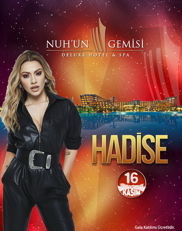 Hayranlarının dillerinden düşmeyen “Aşk Kaç Beden Giyer”, “Sıfır Tolerans”, “Deli Oğlan”, “Nerdesin Aşkım” gibi sayısız hit pop şarkısını seslendiren Hadise; Kıbrıs’ın en güzel bölgesinde konumlanmış Nuh’un Gemisi Deluxe Hotel & Spa’da harika şovları ile muhteşem bir konser vererek sizi; aileniz ve sevdiklerinizle muhteşem bir eğlenceye davet ediyor.