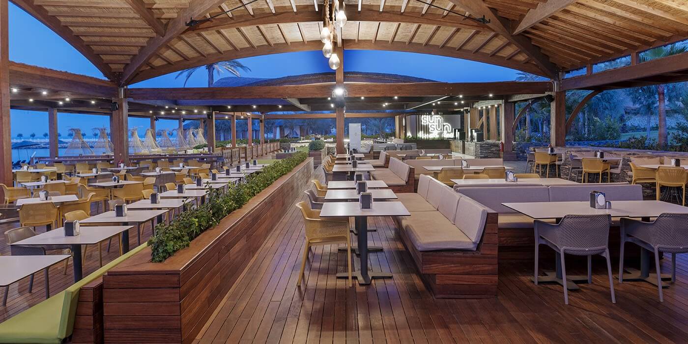 Altın renkli, ince kumlu plajın hemen arkasında, denizin içinde hissi veren, birbirinden özel kokteylleri ile iyi ki buradayım dedirten Sun & Sun Bar, geceleri canlı müzik eşliğinde misafirlerini ağırlıyor.